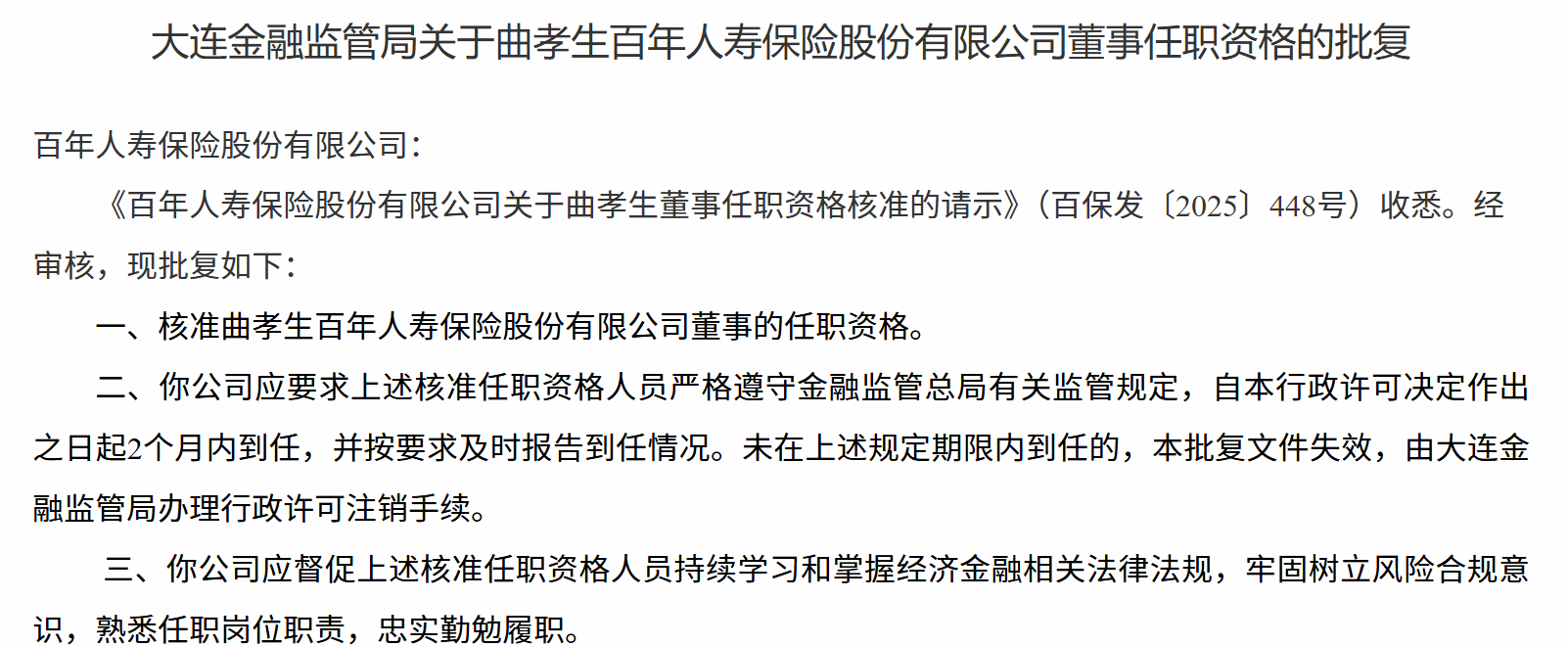 12月29日,大连金融监管局发布关于曲孝生百年人寿保险股份有限公司董事任职资格的批复,核准曲孝生百年人寿保险股份有限公司董事的任职资格。